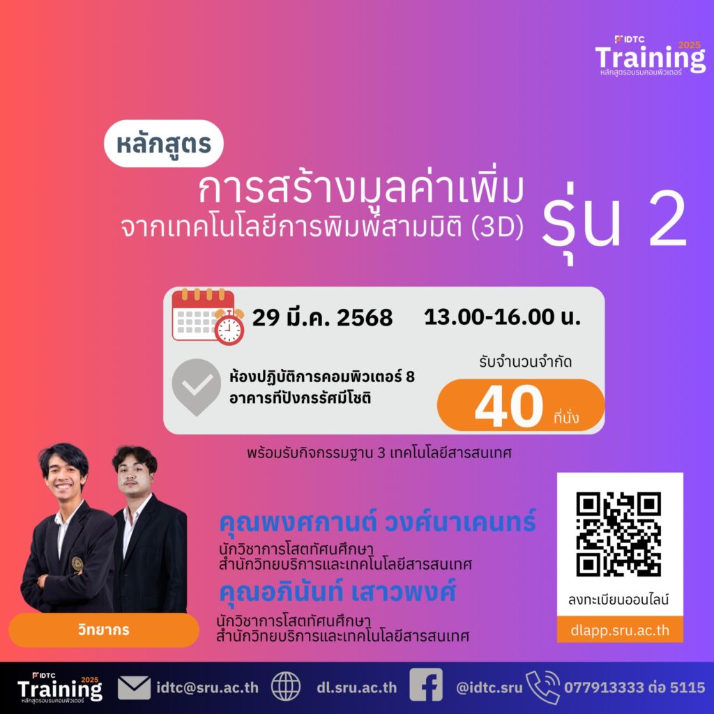 การสร้างมูลค่าเพิ่มจากเทคโนโลยีการพิมพ์สามมิติ (3D) รุ่นที่ 2 (เวลา 13.00-16.00 น. 3 ชั่วโมง) 29/03/2568