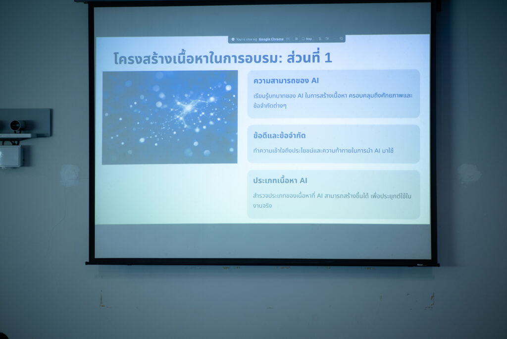 ในการอบรมครั้งนี้ โดยมีการถ่ายทอดความรู้ด้านการประยุกต์ใช้เทคโนโลยี AI ในการสร้างเนื้อหาและการจัดการเว็บไซต์อย่างมืออาชีพ เพื่อเพิ่มพูนทักษะและความรู้ให้กับผู้เข้าร่วมอบรม โดยมุ่งเน้นการใช้เทคโนโลยีเพื่อพัฒนาการศึกษาและสร้างผลกระทบเชิงบวกต่อสังคมอย่างยั่งยืน